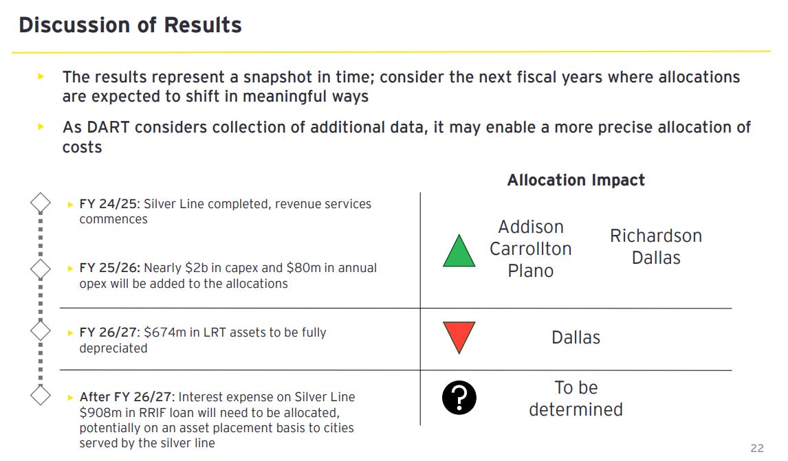 Ten years ago Addison demanded the Silver Line or else they would pull out from DART. So I think this methodology underweights its importance to Addison and overweights it to Dallas’s 2 stations and significantly more track miles. Regardless, even with this methodology, Addison completely flips from being a “donor city” to a donee. If a report completely flips its results from one year to the next with no actual changes, it’s less than useless, it’s dishonest.