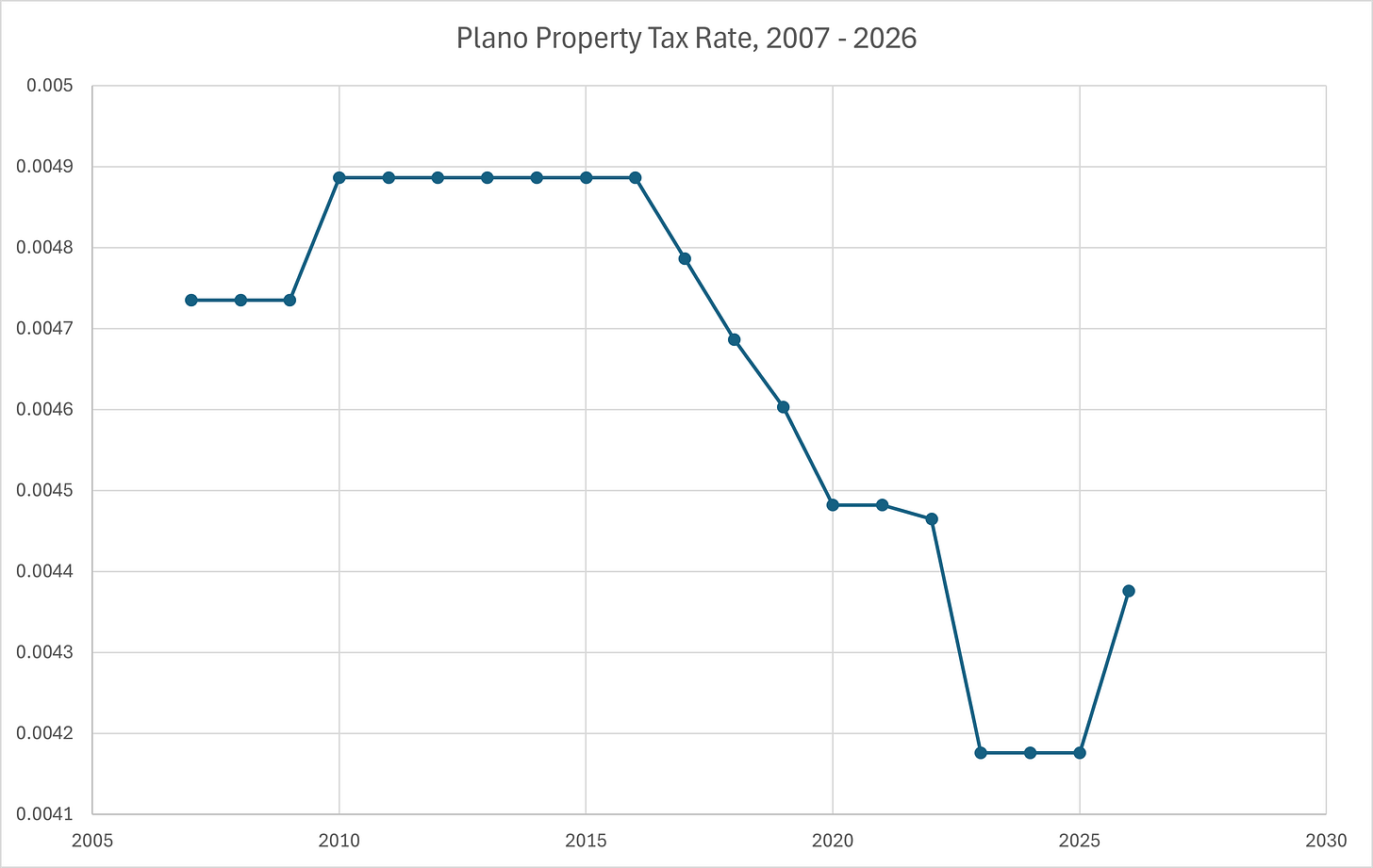 The chart above shows the historic property tax rate in the City of Plano. Plano has always had a much lower property tax rate than other DART cities excluding the Park Cities (the second lowest is Carrollton, at 0.0053875% vs Plano’s 0.004376%). From 2019 to 2023 Plano adopted the No-New-Revenue rate as their de-facto budget rate as the makeup of city council shifted to support this. Eventually, they hit the wall of unsustainability and have raised their tax rate for 2026, with some of that extra cash going to a $4 million line item for a microtransit alternative program. They even had to take out a historic bond package that included $316 million for road repairs - something that should have been handled by their annual O&M budget. There wasn’t enough money to do regular maintenance on infrastructure and the bill came due in a dramatic way.
