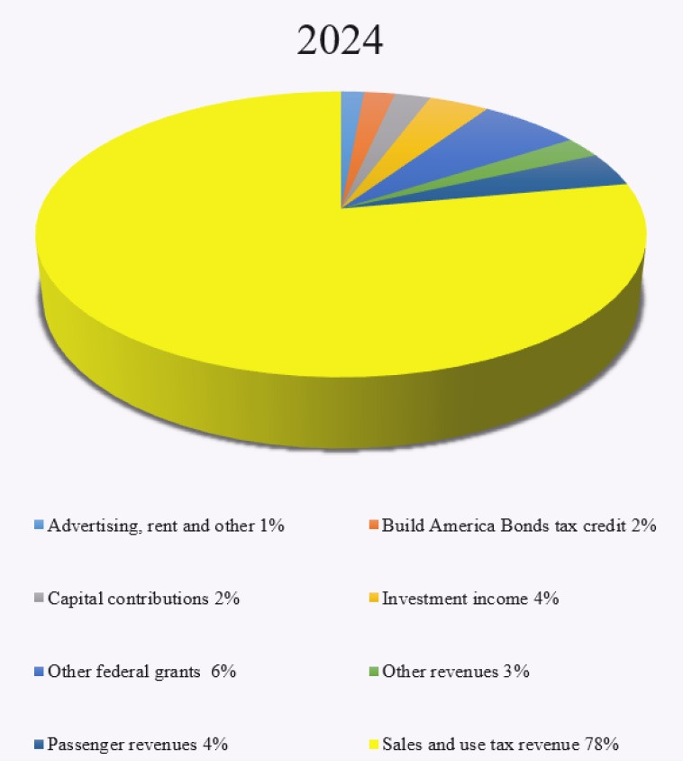 In 2024, 78% of DART’s revenue came from the 1 cent sales tax. Other revenue came from fares, federal grants (which vary wildly year to year), ad revenue, and miscellaneous sources.